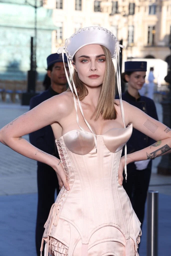 Cara Delevingne knows how to impress the public. For her appearance at the event preceding the opening of the Vogue World: Paris exhibition in the French capital, dedicated to the symbiosis of sports and high fashion, the model and actress chose a marine theme and lingerie style. She appeared in a nude corset dress with a bra in the form of conical cups, reminiscent of horns in shape. The original look was completed with a hat in the same color, taken from the sailors' wardrobe, as well as ballet flats with stiletto heels that echoed the shape of the top. The authorship of this intricate outfit belongs to one of the brands that are part of the Parisian Syndicate of High Fashion, namely, Jean Paul Gaultier and its invited creative director, the British Simone Rocha.