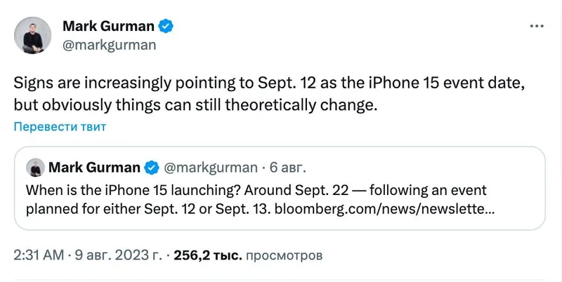 Mark Gurman shared information about the presentation date of the new iPhone 15 on his Twitter. Photo source: Twitter