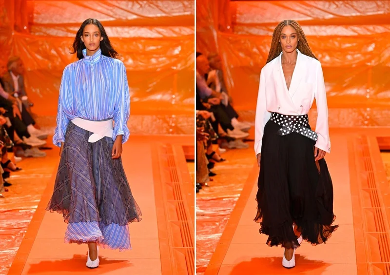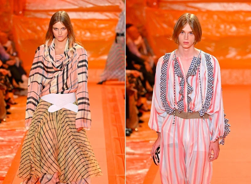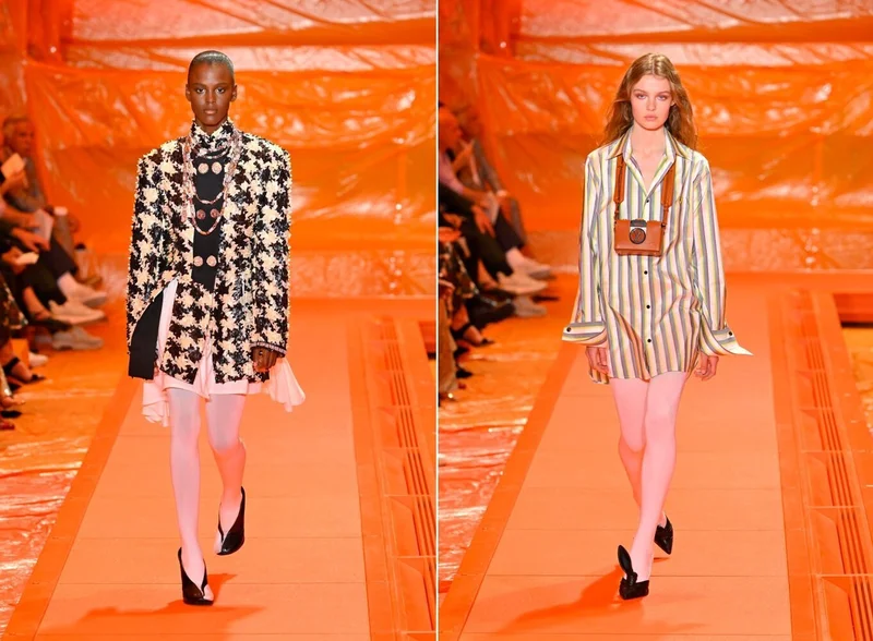 In a surreal shade of orange, the Louis Vuitton “showcase” under the deft hand of creative director Nicolas Ghesquière was a mixture of eras and emotions. Vibrant color, conveying the harlequin vibe, took center stage. High-waisted striped trousers and billowing yellow silk sleeves paid homage to bygone times, while modern ski goggles recalled Ghesquière's tireless innovation. 70s style also got its moment of fame. Striped shirts with turned-down cuffs, reminiscent of that era, were combined in a delicate and free flow with the firm and decisive presence of a small camera styled as a necklace. This apparent contradiction - the combination of soft and hard - illustrated Ghesquière's talent for playing with contrasts.