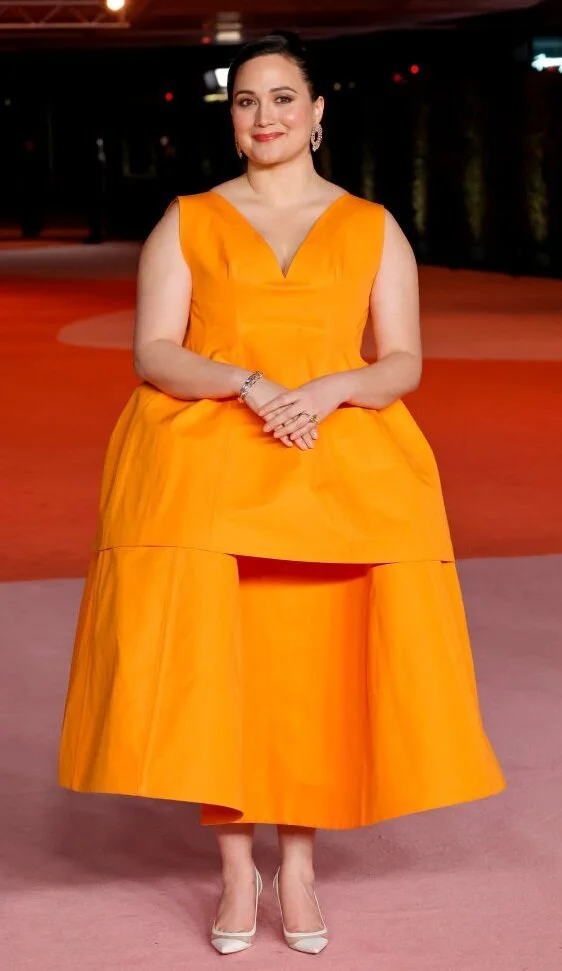 DiCaprio's co-star in the thriller Martina Scorsese chose an unusual bright orange Marnie dress with a bell skirt, deep neckline and wide straps for her appearance at the evening. Lily completed her look with cream pumps, her hair tied up in a high bun and a sweet smile that won the hearts of all photographers without exception.