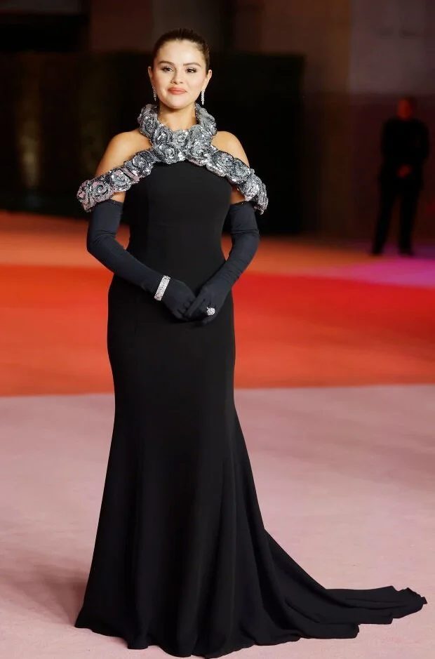 The 31-year-old singer/actress wore a black evening dress with long black gloves and a statement cape collar necklace made of silver roses. Selena emphasized her strict look with a laconic bun and diamond jewelry.