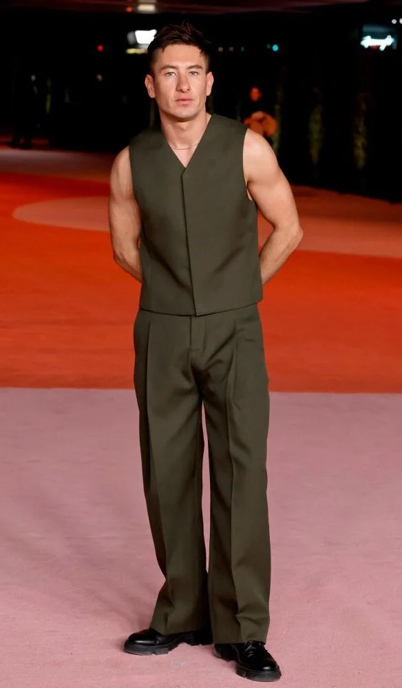 The main star of the new film, Emirald Fennell, “Saltburn,” appeared on the red carpet in a brown suit consisting of trousers and a vest. The actor emphasized his succinctly brutal image with thick-soled boots, impressive biceps and a slightly tousled hairstyle.