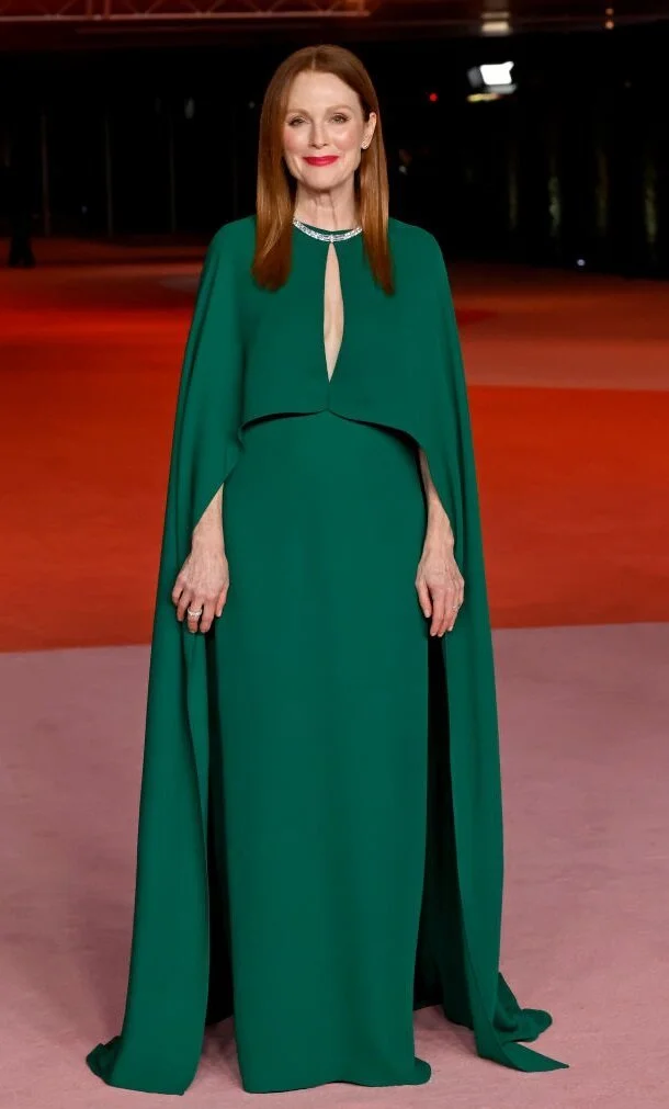 Natalie Portman's co-star in the film May December celebrated her 63rd birthday at the Academy Museum Gala 2023. For this occasion, Julianne wore a “royal” cape dress in a rich green color, which perfectly set off Julianne’s red hair, which was styled in a minimalist style. A modest smile and immodest diamond necklace and rings completed the elegant look.