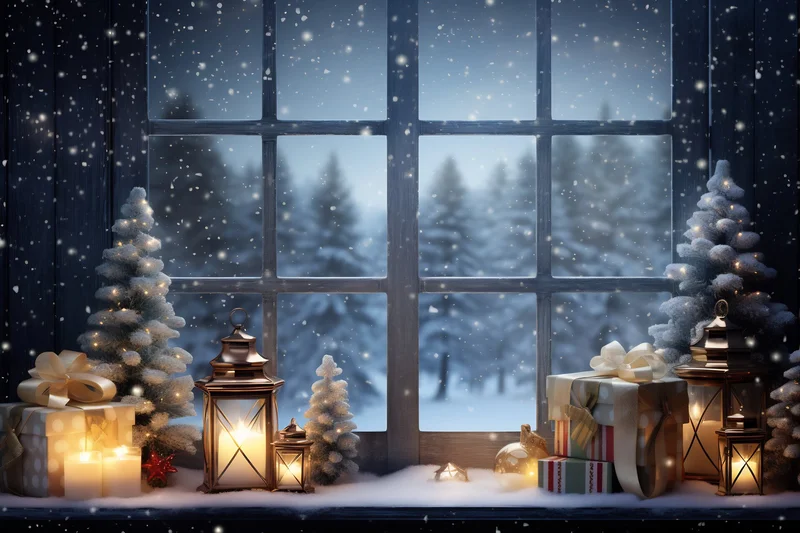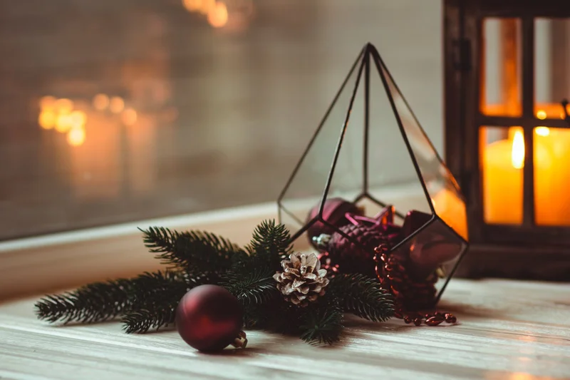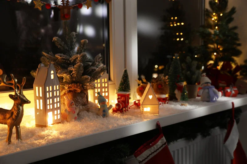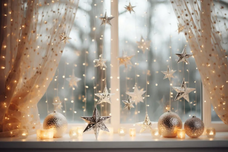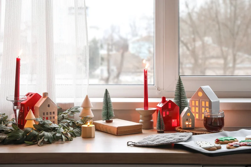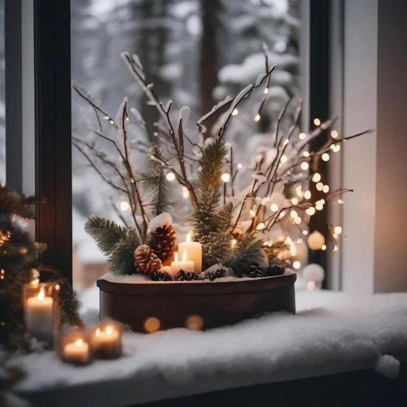 Christmas decorations can be placed on the windowsill. Small wooden Christmas trees next to candles and natural garlands will be enough. Candles, small garlands and other decorations and details will give your window a special holiday spirit.