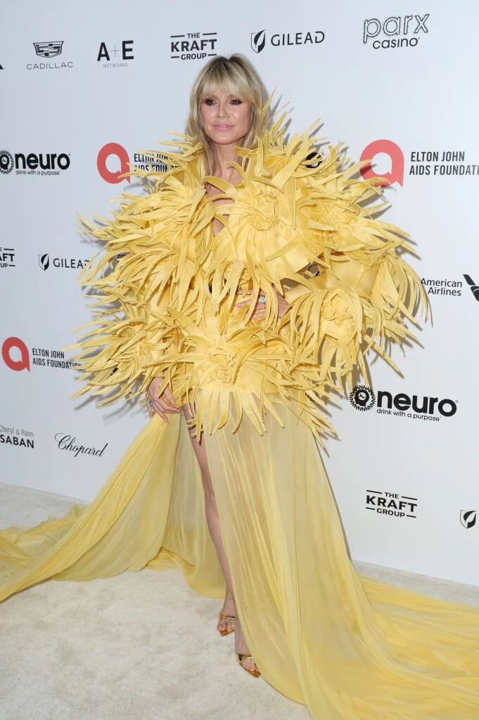 Later, at a charity evening organized by the Elton John AIDS Foundation, the star came in a yellow voluminous jacket with feathers and a dress of the same color. She reminded her subscribers of a puppet doll.