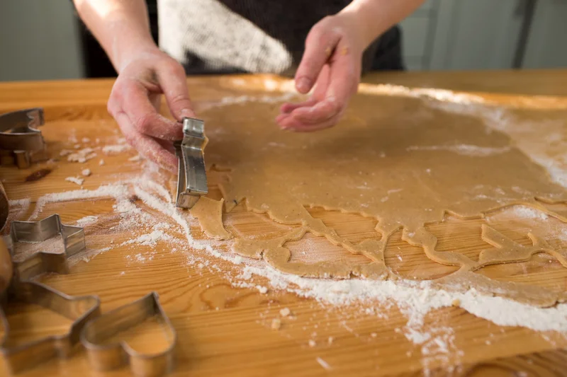 Roll out the dough between two sheets of baking paper sprinkled with flour to prevent it from sticking and roll it out with a rolling pin until it is about 0.5 cm thick. Using cookie cutters (you can choose any shape you like), cut the dough.