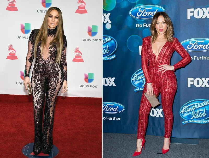 Fast forward a few years and our heroine and founder of the J.Lo Beauty brand has developed a love of not only bodycon dresses, but also bodycon jumpsuits. In 2016, she rocked a custom sequined design on the season finale of American Idol, a skintight sheer ensemble at the Latin Grammys, and a denim jumpsuit at the Jen Klein Day of Indulgence.