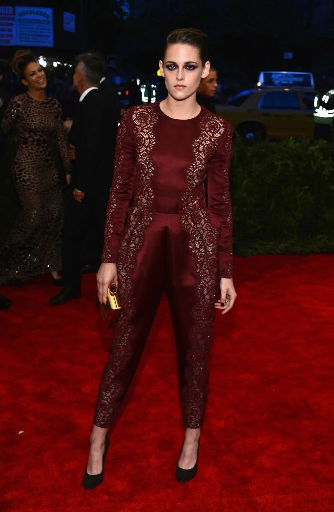 Gothic is a refrain in Stewart's outfits on the franchise's carpets. And I must admit, black suits her better than beige.
