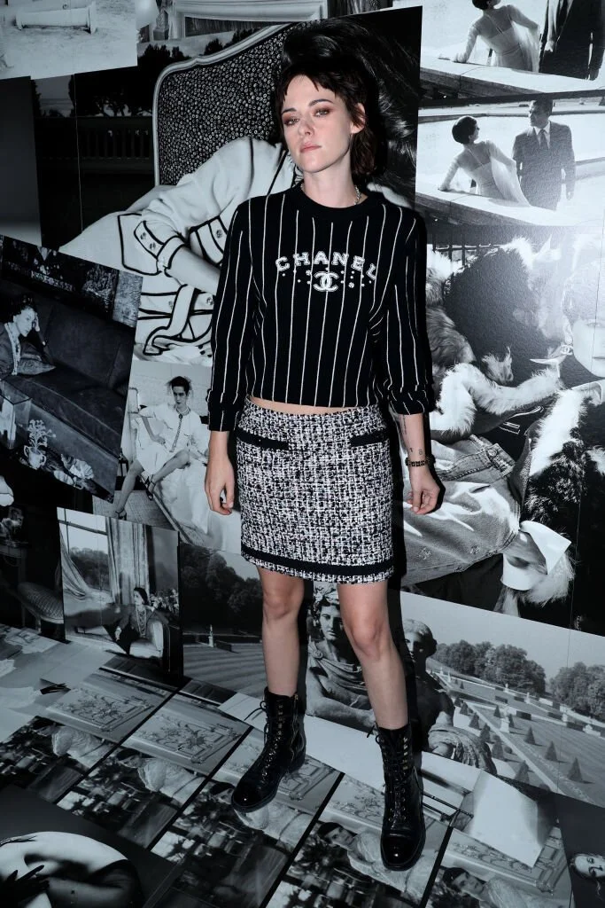 Another “Chanel girl” look is a black tweed suit with super short shorts. Kristen's legs had not deteriorated over the years, so she looked quite organic.