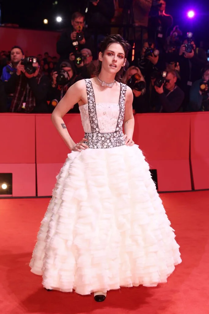 A different interpretation of “Edward’s Bride”, from Chanel and the matured Stewart. At the Berlin Film Festival, she appeared in a luxurious black and white Chanel dress, with a mullet hairstyle and a bow necklace.