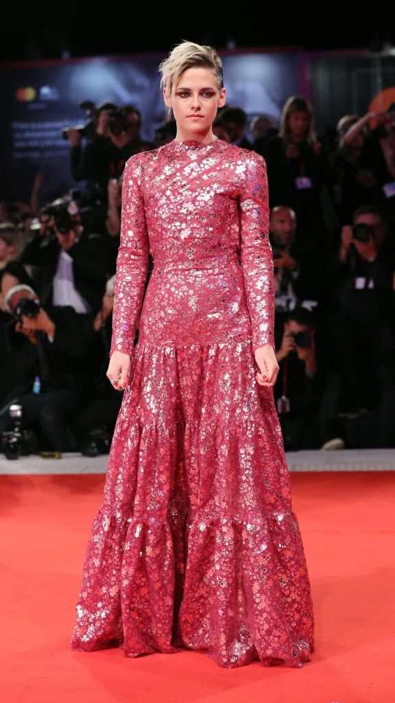 For the Venice Film Festival, the actress made an exception and wore a luxurious dress of rich berry color with sparkles. But the asymmetrical hairstyle served as a reminder of her commitment to the “edgy” style.