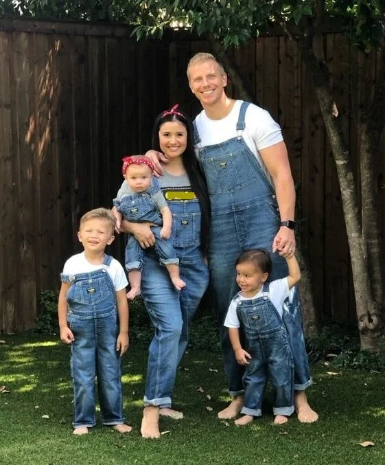 Greetings from the 90s: Fashionable overalls for a family photo shoot