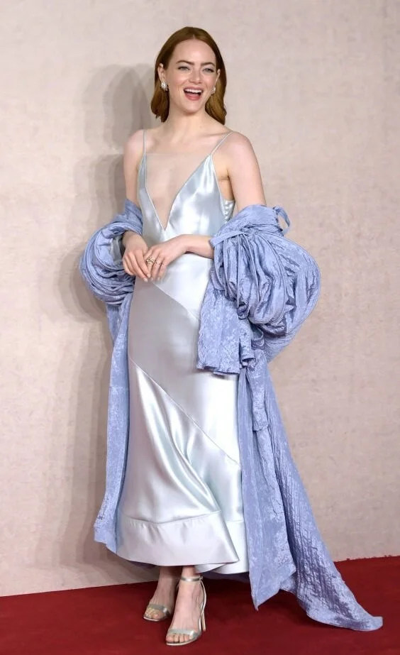 Emma Stone attended the premiere of her new film "The Unfortunate" in London. She appeared in front of photographers in a soft blue silk slip dress and a textured shawl a shade darker. The actress’s image was reminiscent of Hollywood divas of the past - Audrey Hepburn, Elizabeth Taylor and others.