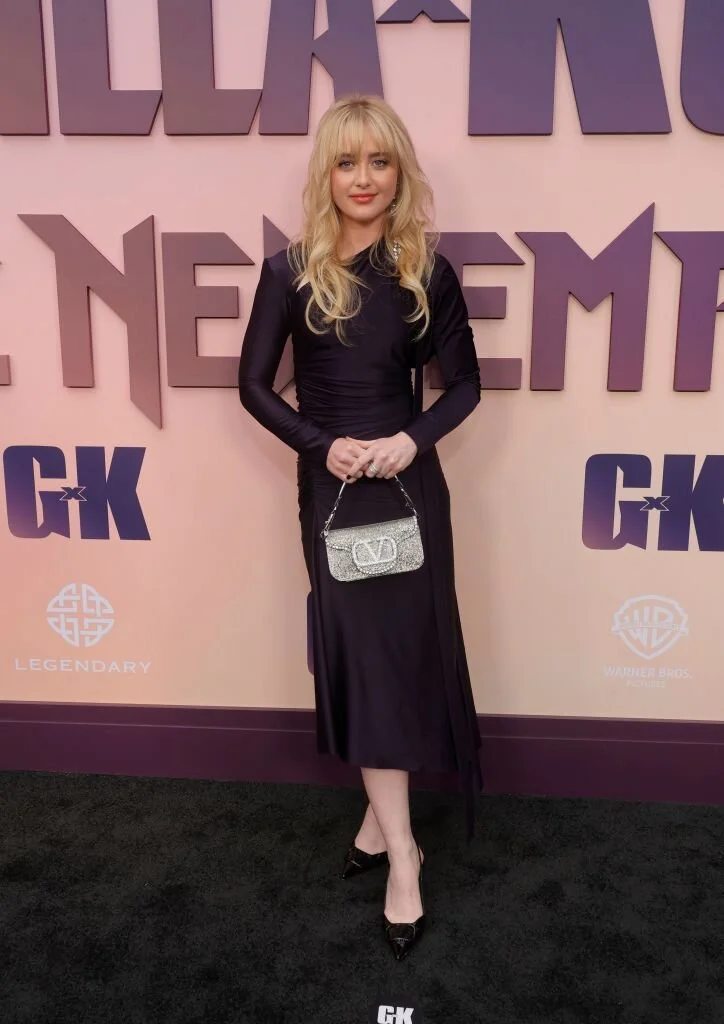 The star of the recent youth horror film "Lisa Frankenstein" was also in attendance at the premiere of "Godzilla and Kong". She was prepared for her appearance on the dark gray carpet by Italian fashion house Valentino: a flowing dress with draped asymmetrical top of rich purple color, silver jewelry and the same handbag with a large logo of the brand.