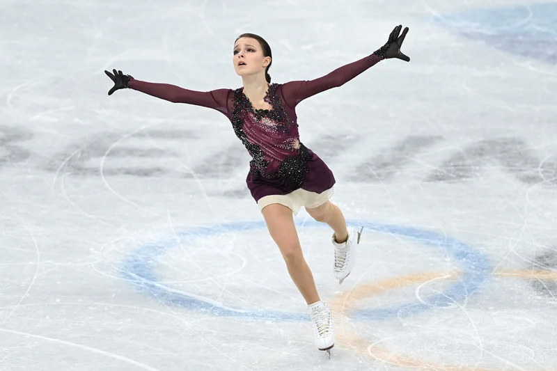 Anna Shcherbakova's burgundy dress (free program, 2022 Olympics)